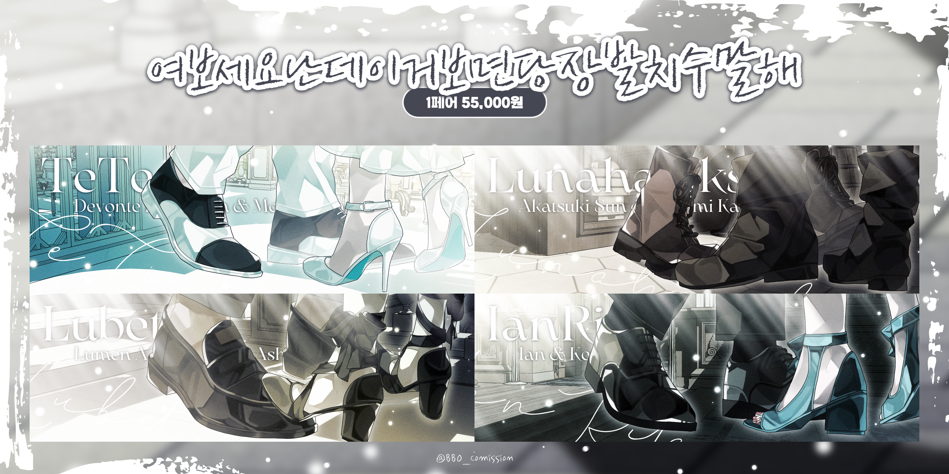 - A가 B 발을 밟고 있어요 등등... 간단하게라도 적어주셔야 만족스러운 결과물이 나옵니다. (연인다운 분위기, 그냥 ~~한 분위기 <라고 지칭하시면 그냥 일반적인... 보통의 마주 보고 있는 신발 구도가 나옵니다ㅠ_ㅠ!) 적어주신 장면을 제 나름대로 최대한 맞춰드리려고는 하나 경우에 따라 표현이 불가능할 수도 있습니다ㅠ_ㅠ!!! 더 수련하여 모든 분들의 니즈를 맞출 수 있도록 노력하겠습니다... (아주 간단하게라도 구도 그려서 보내주시면 참고합니다.)