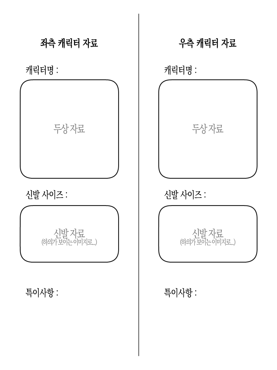 - 파이널 판타지, 마비노기 등 게임 판타지류 신발 신청은 받지 않습니다ㅠ_ㅠ~! 생략이 많이 되어도 괜찮다면 신청서 작성 전 제게 꼭 문의 부탁드립니다.
