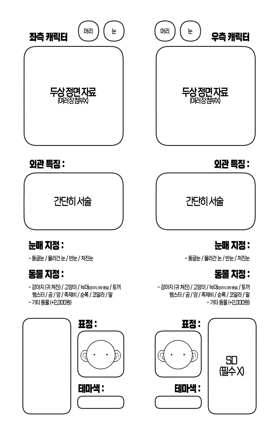 - 이외의 신청서 자료를 첨부하는 경우 색, 표정 지정이 불가능합니다. (두상 표정 그대로 / 색상 오마카세로 작업) 두상 1장, 외관 특징, 색상표만 적혀있는 자료(ex. 나나곰 자료 페어틀)만 접수 받으며, 기재된 것 이상으로 첨부되어 있을 시 접수 받지 않습니다. (특히 캐릭터 서사 설명 등 고정틀 작업에 불필요한 정보가 들어간 자료 접수 받지 않습니다ㅠ_ㅠ!)