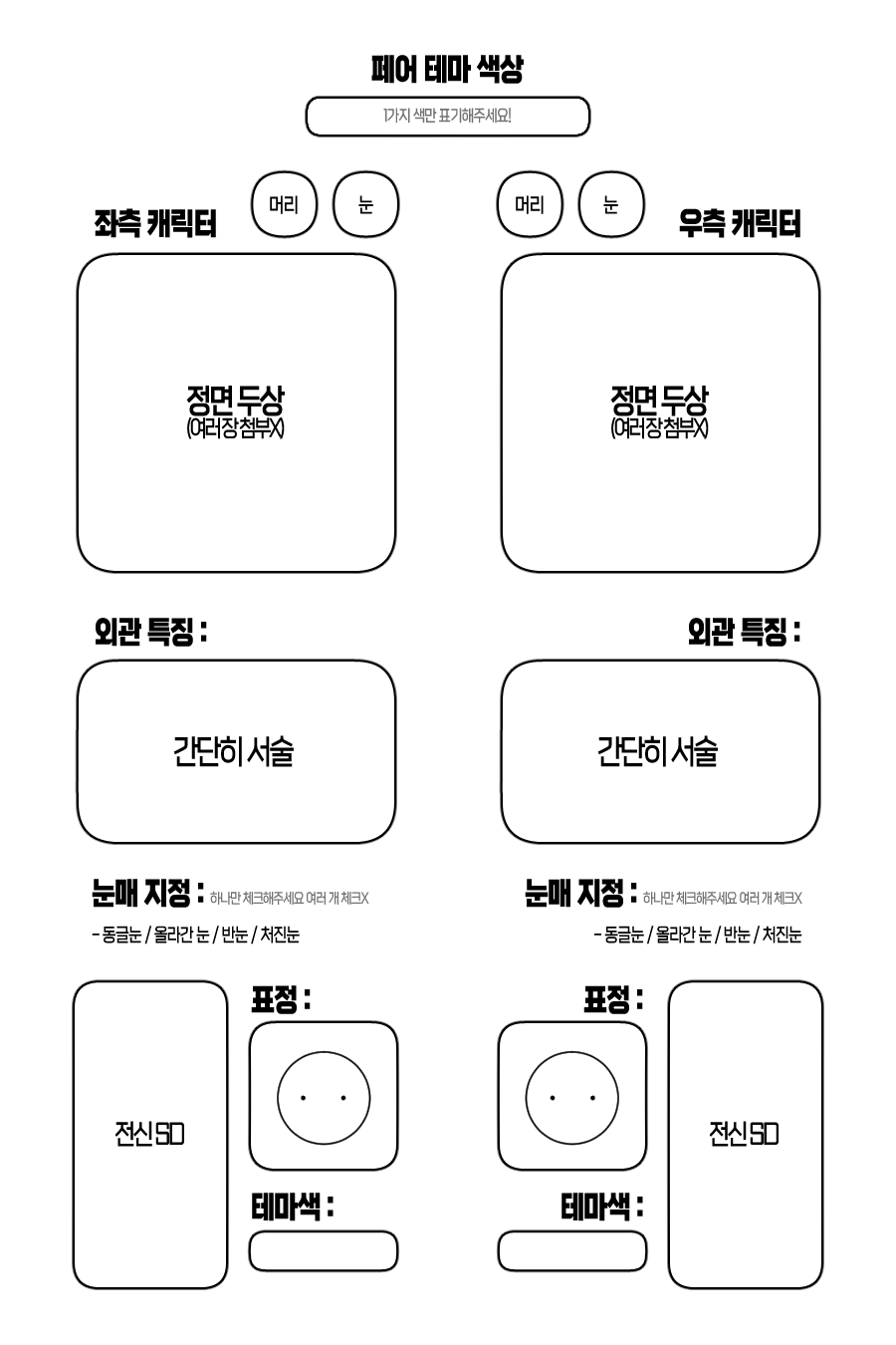 인상이 잘 보이는 정면 두상 1~2장 / 외관 특징 / 캐릭터 컬러 파레트가 기재된 최대한!!! 간단 페어 자료 첨부 부탁드립니다.